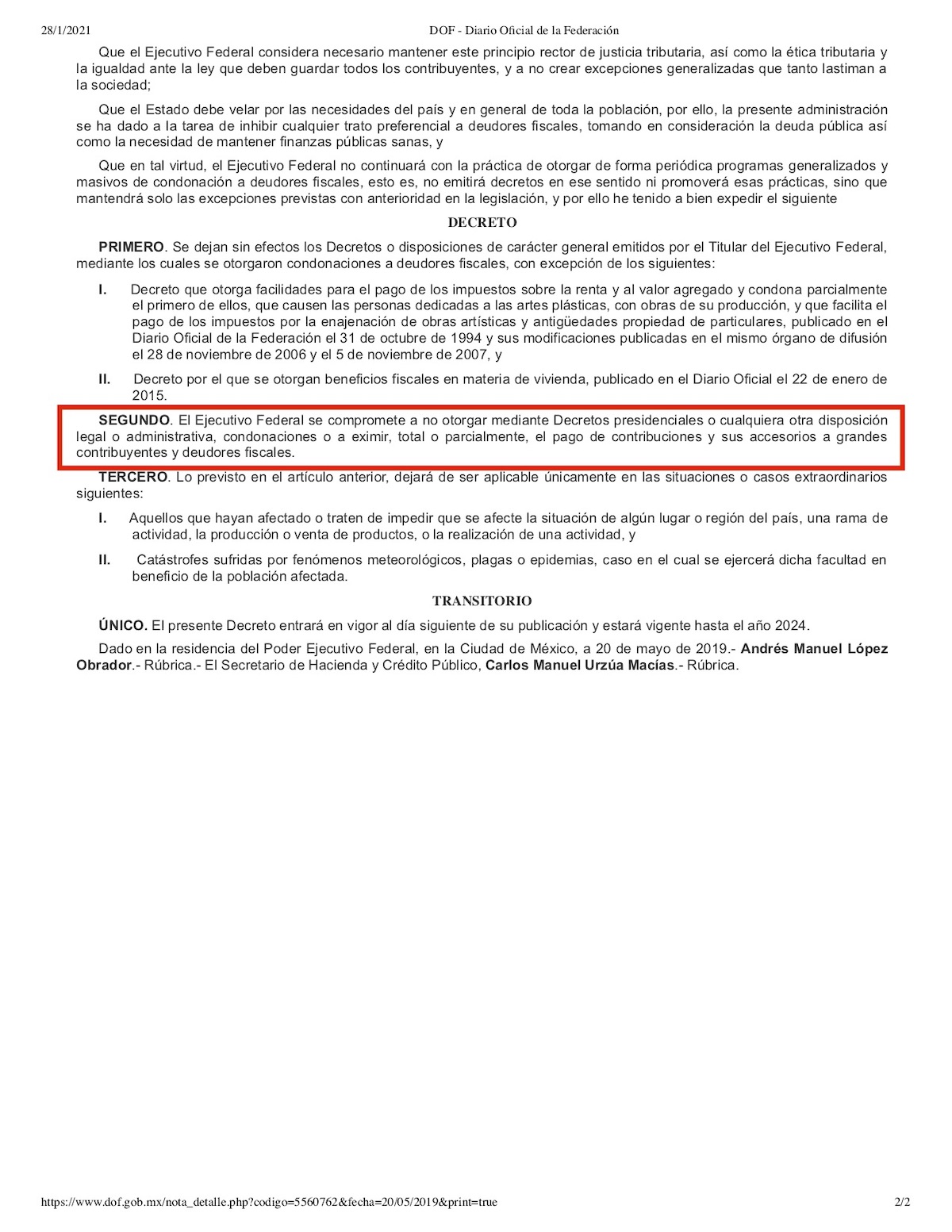 Para tal efecto, el presidente de México expidió un decreto que se publicó en el Diario Oficial de la Federación el 20 de mayo de 2019, en el que asume esa obligación: “El Ejecutivo Federal se compromete a no otorgar mediante Decretos presidenciales o cualquiera otra disposición legal o administrativa, condonaciones o a eximir, total o parcialmente, el pago de contribuciones y sus accesorios a grandes contribuyentes y deudores fiscales”. Por “accesorios” se refiere a multas generadas por el retraso del cumplimiento con el fisco.