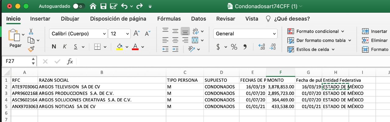 Los registros del SAT muestran que las empresas comandadas por Epigmenio Ibarra recibieron sendas condonaciones fiscales en marzo de 2019, enero de 2020 y enero de 2021. La base de datos refiere cuatro razones sociales: Argos Televisión, Argos Producciones, Argos Soluciones Creativas y Argos Noticias.