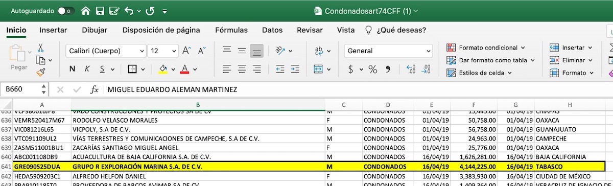 Grupo R Exploración Marina, empresa asentada en Tabasco de José Ramiro Garza, tanto padre como hijo, mencionados en los Panamá Papers y que según su portal en Internet es la empresa que más pozos marinos ha perforado para Pemex, recibió una condonación superior a los 4 millones de pesos de impuestos. Esta empresa ha mantenido contratos con la empresa paraestatal desde la administración de Felipe Calderón.