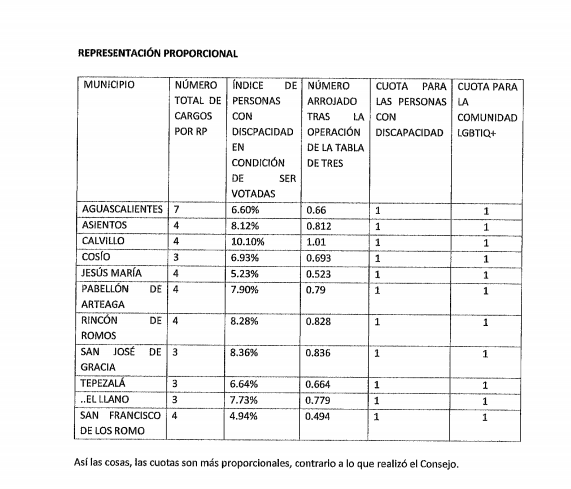 La activista destaca especialmente el considerando décimo primero, inciso B) proporcionalidad, ya que el IEE reconoce que la comunidad de la diversidad no está contabilizada en la entidad ni en los municipios, toma como base el Censo de Población y Vivienda 2020 del Inegi sobre la población con alguna discapacidad y lo toma como base también para la población LGBTI+, los que arroja en su tabla de resultados debe ser multiplicado por dos, pues de lo contrario se incluye en una cifra a los dos grupos segregados, lo cual “matemáticamente es incongruente y legalmente violatorio del principio de proporcionalidad al reducir el dato estadístico al 50%, lo cual es lógico que los espacios o cuotas que pretende concretar se vean disminuidos, determinación contraria al principio pro persona”.