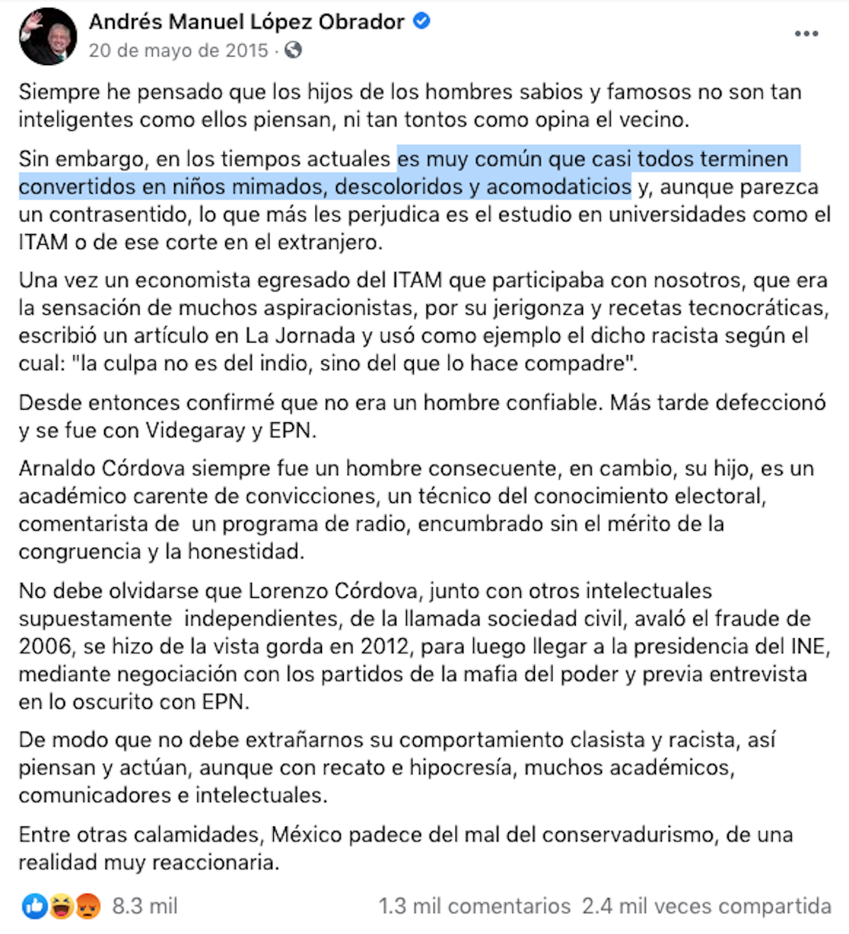 “Siempre he pensado que los hijos de los hombres sabios y famosos no son tan inteligentes como ellos piensan, ni tan tontos como opina el vecino. Sin embargo, en los tiempos actuales es muy común que casi todos terminan convertidos en niños mimados, descoloridos y acomodaticios y, aunque parezca un contrasentido, lo que más les perjudica es el estudio en universidades como el ITAM o de ese corte en el extranjero”, manifestó López Obrador ese 20 de mayo de 2015 en su cuenta de Facebook.