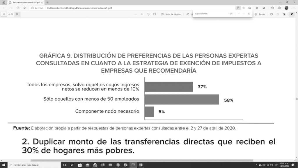 Esta política plantea dos posibles esquemas. En el primero, todas las empresas estarían exentas de pagar impuestos, salvo aquellas cuyos ingresos netos se reduzcan menos de 10%. En el segundo esquema, sólo las pequeñas y medianas empresas (aquellas con 50 o menos empleados) quedarían exentas del pago de impuestos. En cuanto a qué empresas otorgar estos apoyos, 58% opinó que la exención debe aplicarse sólo a las empresas con menos de 50 empleados, mientras que 37% considera que el criterio que se debe aplicar es el de pérdidas en ingresos netos y no el tamaño de la empresa.