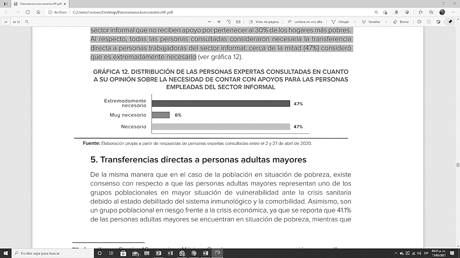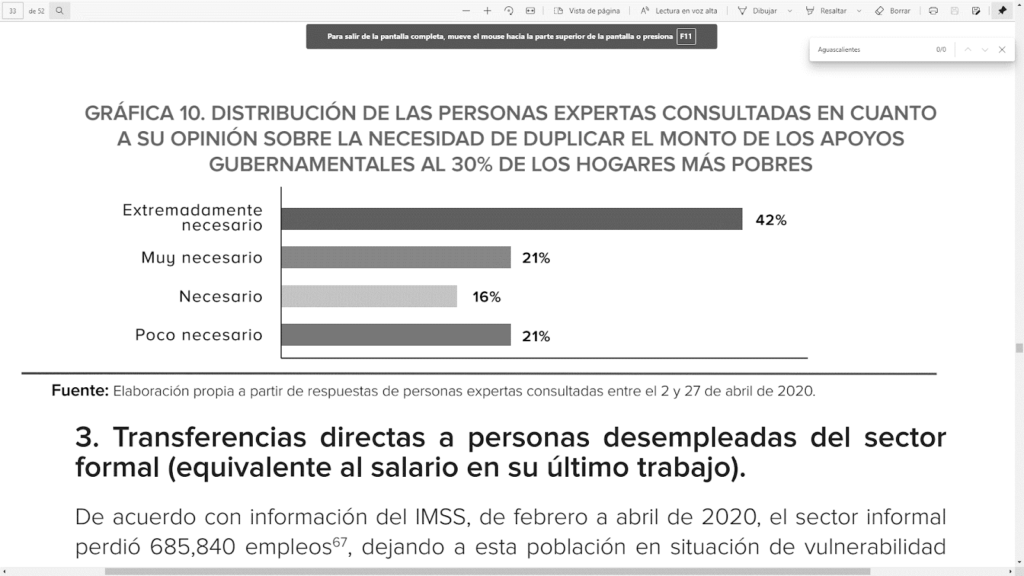 Al respecto, 95% de las personas expertas consultadas considera necesario contar con apoyos, entendidos como transferencias directas, para las personas que laboraban en el sector formal y que hayan perdido su empleo, proporción mayor a la de quienes consideran necesario duplicar los apoyos a la población en situación de pobreza.