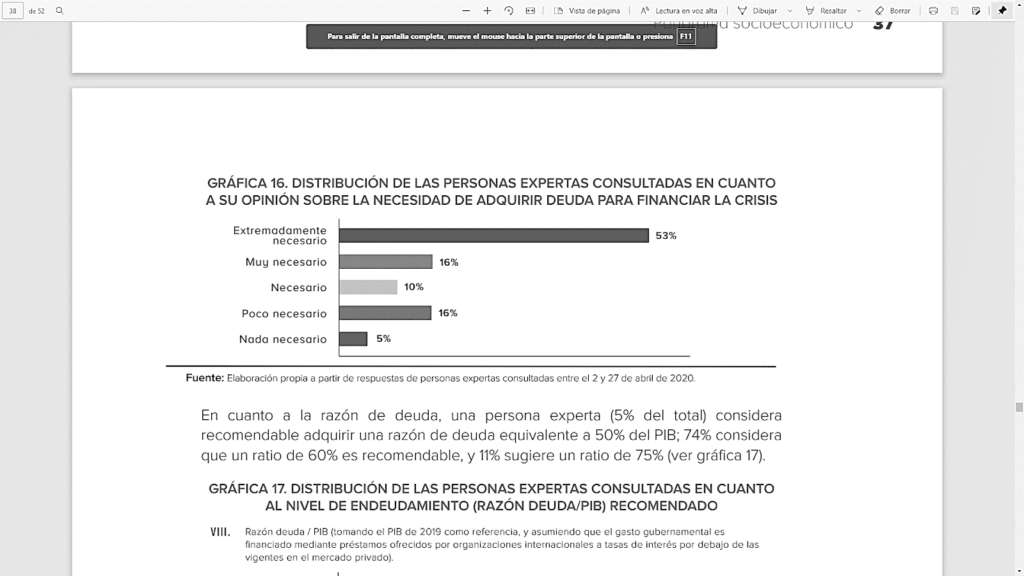 Adquirir deuda es una de las herramientas a disposición de los funcionarios para tal fin. Sin embargo, tomando en cuenta que la actual administración federal tiene como base la austeridad presupuestal, se ha señalado que no se está considerando esta opción con la finalidad de mantener finanzas austeras. Pero el 79% de los expertos están considerando que la adquisición de deuda es necesaria para minimizar los efectos recesivos de esta crisis.