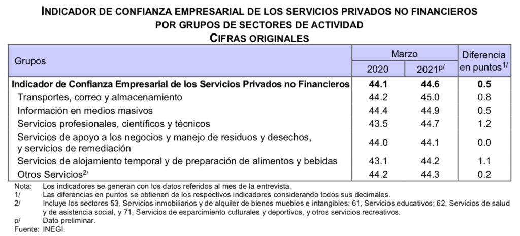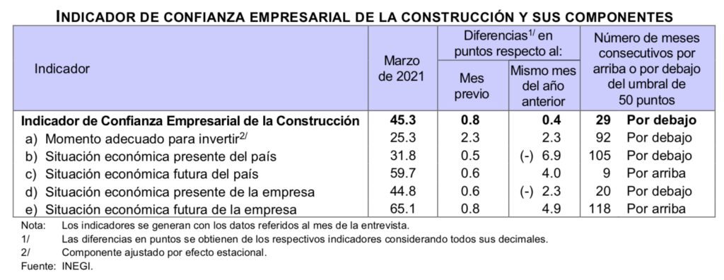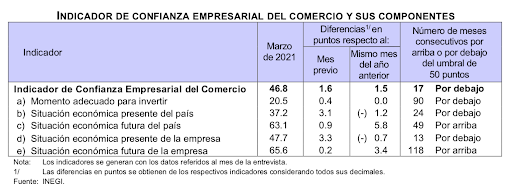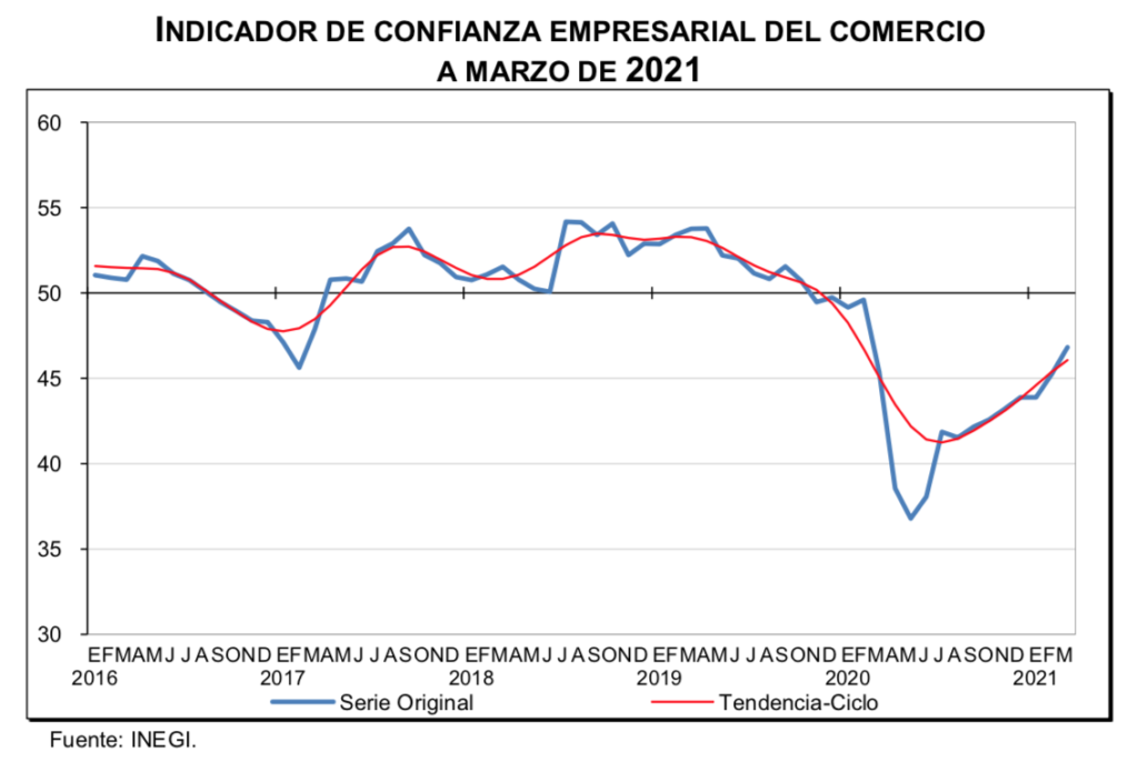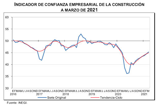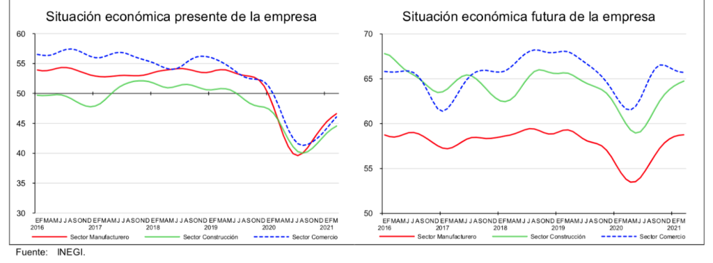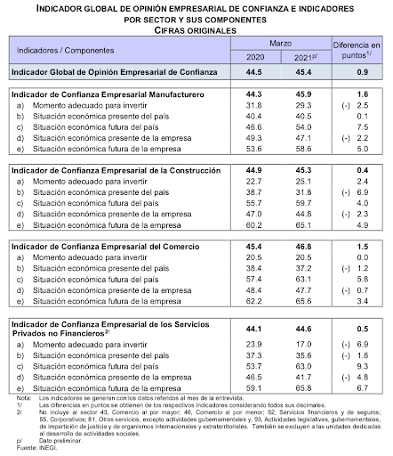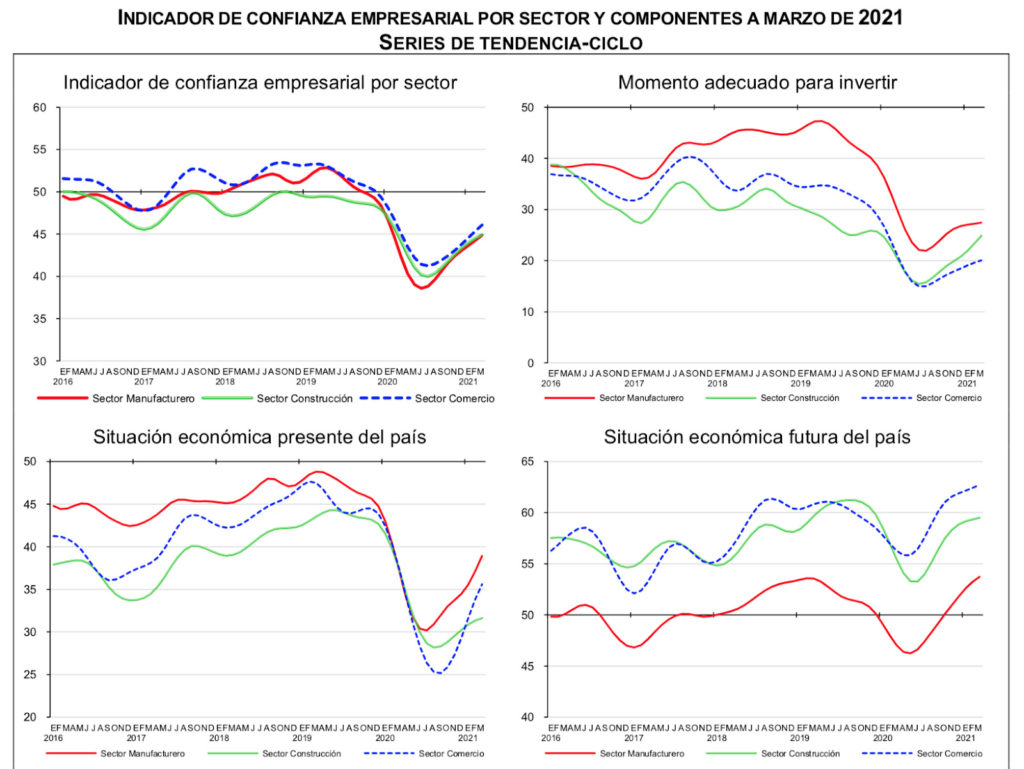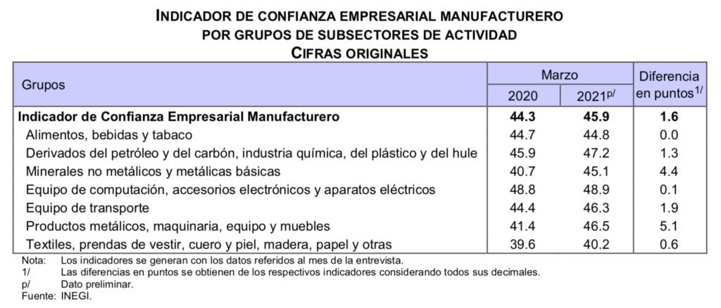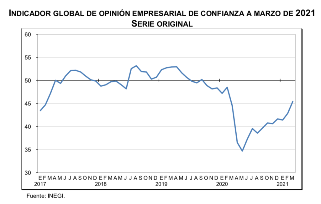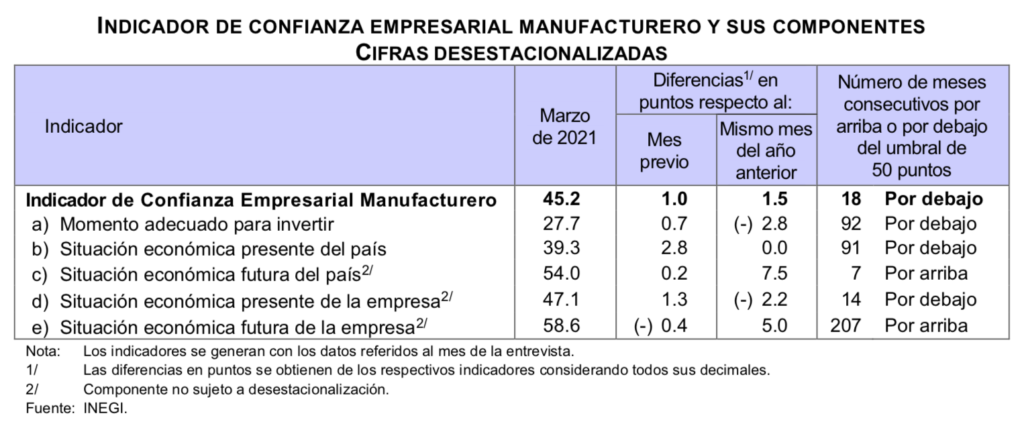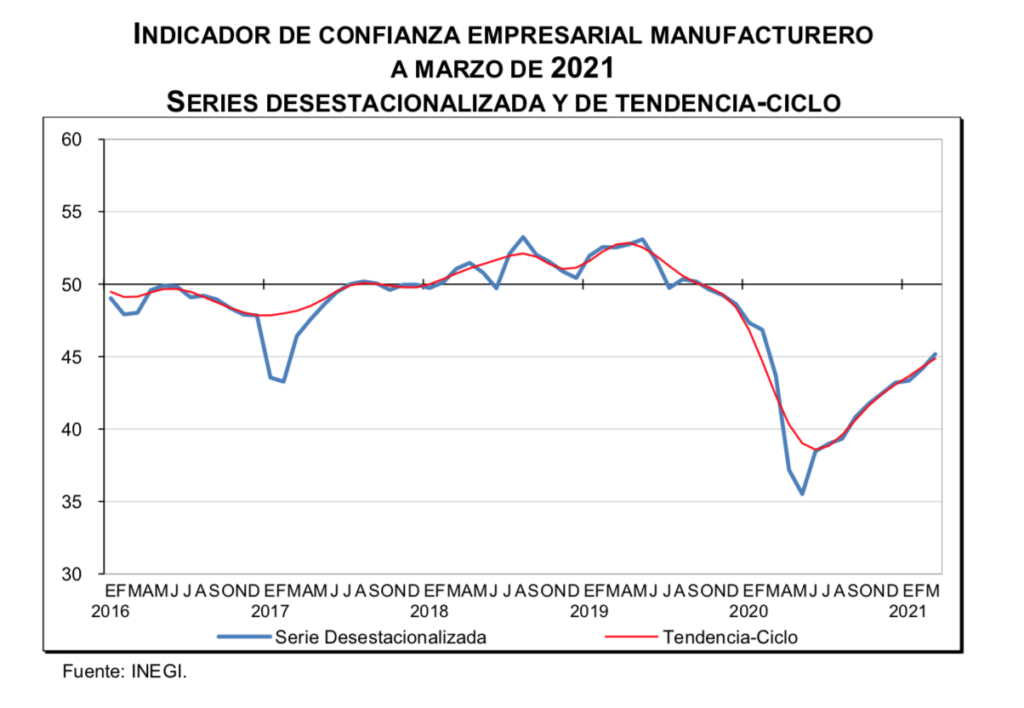 El Indicador de Confianza Empresarial Manufacturero se ubicó en 45.2 puntos en marzo de 2021, nivel superior en 1 punto respecto al del mes inmediato anterior, según series desestacionalizadas. Con este dato el Indicador de Confianza Empresarial Manufacturero se mantiene por 18 meses consecutivos por debajo del umbral de los 50 puntos.