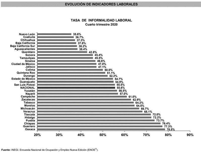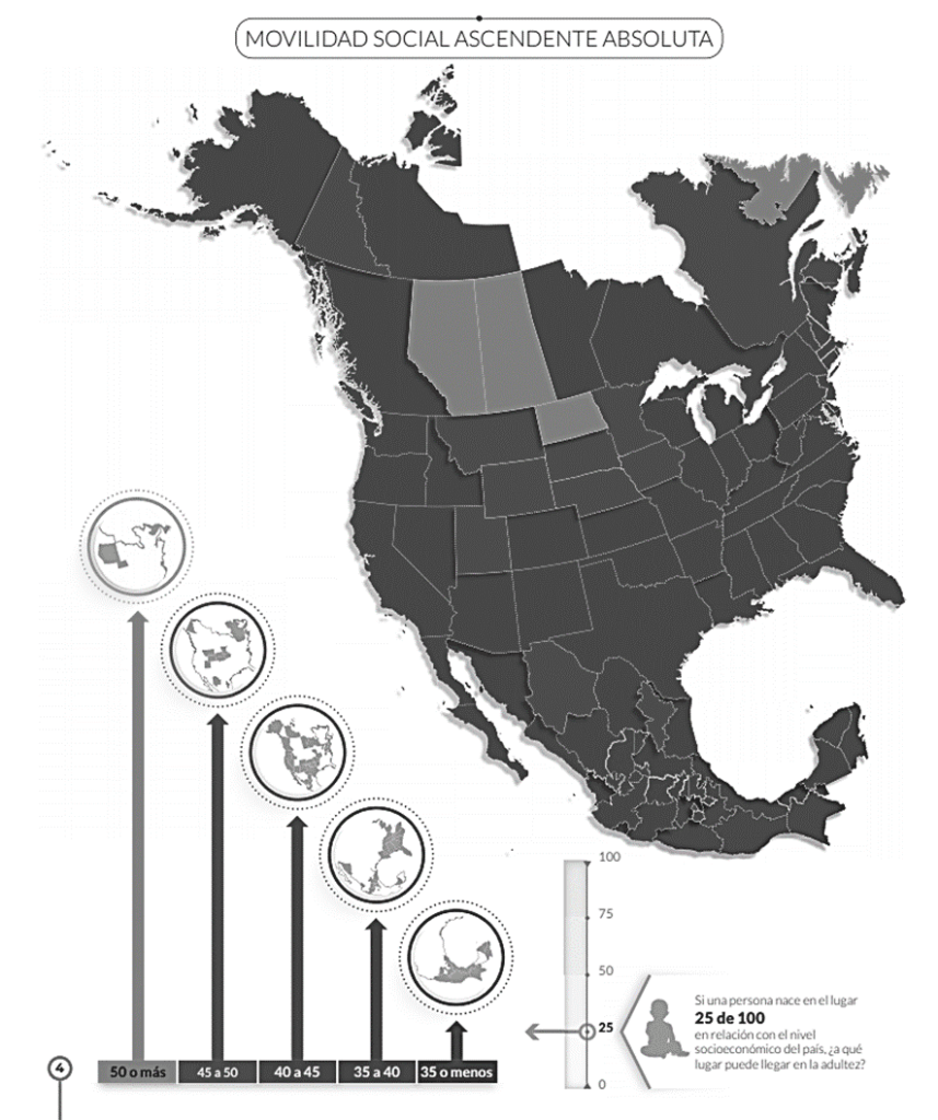 Los estados como Chihuahua, Nuevo León y Aguascalientes, presentan mayor crecimiento económico; menor hacinamiento, informalidad y empleo juvenil, estas variables propician un mayor índice de movilidad social ascendente absoluta. A diferencia de entidades como Chiapas, Guerrero y Tabasco donde, en forma contraria, el crecimiento económico es menor y con mayor presencia de informalidad, hacinamiento en las viviendas y de empleo juvenil.
