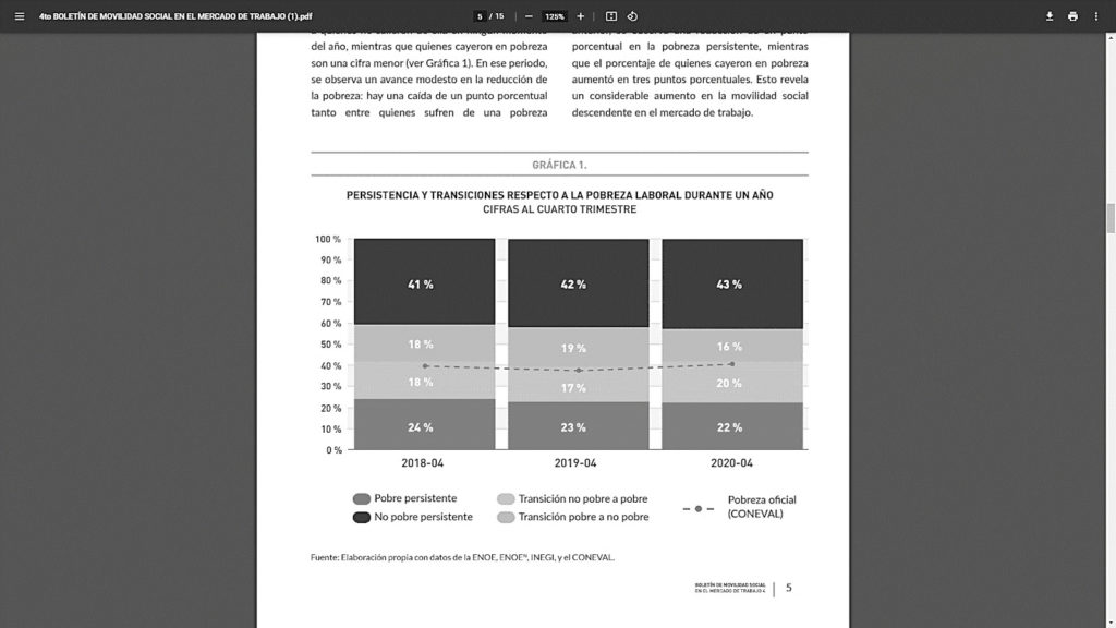 Así, al término de 2020, 53.5 % de la población correspondiente al 20 % con menor ingreso (Quintil 1) se mantuvo en este grupo, mientras que esta cifra fue de 56.1 % en 2019. Además, la movilidad ascendente, desde el quintil más bajo de ingreso (Quintil 1) hacia el quintil más alto (Quintil 5), aumentó: pasó de 3.9 % en 2019 a 5.1 % en 2020. En el otro extremo de la escalera de ingreso laboral, 55.1 % de quienes iniciaron en el quintil más alto permanecía ahí al cuarto trimestre de 2020, mientras que este porcentaje fue de 56.3 % durante el mismo periodo de 2019. En lo que respecta a la movilidad descendente del quinto al primer quintil, el porcentaje pasó de 3.7 % en 2019 a 4.2 % en 2020.