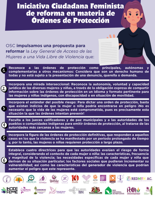 Si bien, a raíz de la reciente reforma a la Ley General de Acceso de las Mujeres a una Vida Libre de Violencia, publicada el 18 de marzo de 2021, se realizaron cambios trascendentales en el esquema regulatorio de las órdenes de protección en la dirección correcta, las OSC involucradas en este esfuerzo ciudadano colectivo destacan la necesidad de replantear la regulación de las órdenes de protección desde las experiencias que viven las propias mujeres, con el fin de asegurar que las órdenes realmente son accesibles para todas las mujeres y niñas, y evitar que la violencia de la que son víctimas muchas mujeres y niñas mexicanas escale hasta sus niveles más graves, como el feminicidio.