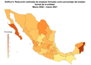 La gráfica 5 muestra la variación porcentual estimada de empleos formales por entidad federativa respecto de la que existía en esa misma entidad doce meses antes. A marzo de 2021, las entidades con mayores caídas de su empleo formal son Quintana Roo (-4.9%), Baja California Sur (-3.9%) y Coahuila (-2.7%).