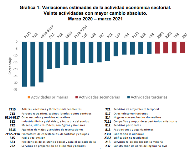 Para marzo de 2021, el modelo estima una pérdida de 536,360 empleos formales en todo el país, comparado con marzo de 2020. A continuación se presentan algunos resultados: En la gráfica 1 se observa que las actividades relacionadas con los servicios son en las que se estima una mayor disminución en la comparación interanual. Destacan actividades de artistas, escritores y técnicos independientes (-32.8%), parques recreativos, casinos loterías y otros servicios recreativos (-32.7%) y otras escuelas y servicios educativos (-29.7%). Las actividades secundarias con la mayor caída interanual serían las relacionadas con la industria de la construcción. En la gráfica 2 se observa que los servicios de preparación de alimentos y bebidas presentan la mayor pérdida estimada de empleos (-94,861), en su comparación interanual, seguido por la fabricación de equipo de transporte (-68,868) y parques recreativos, casinos loterías y otros servicios recreativos (-64,977).