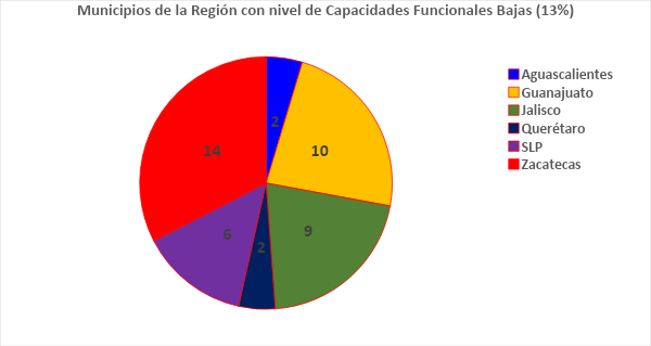 Los estados de la Región califican en índice de capacidades funcionales entre el primer lugar (Aguascalientes) y el lugar 22° (Zacatecas) teniendo los lugares 4,7,8 y 9 para los estados de Guanajuato, Querétaro, Jalisco y San Luís Potosí.