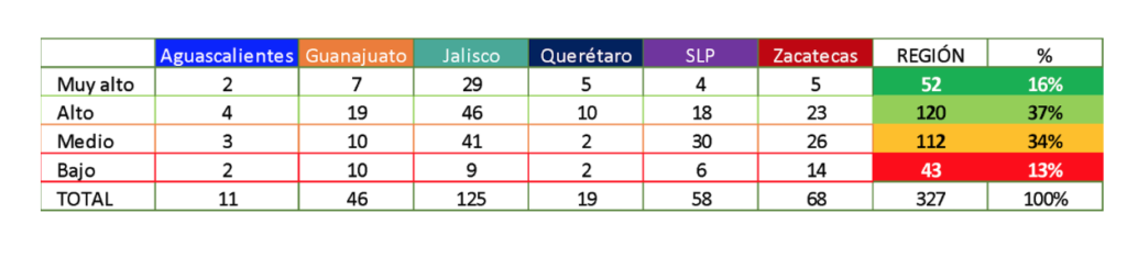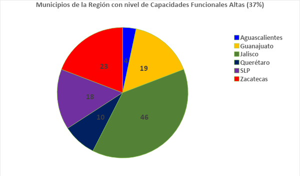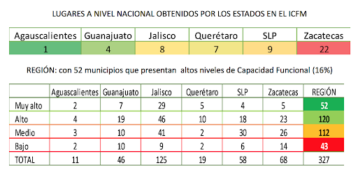 La región consta de 325 municipios de los cuales 52 cuentan con un ICFM muy altas y 120 altas, para un total de 172 o el 52% con ICFM de buen nivel. El 48% restante alcanza: o un nivel “medio” que es el caso de 112 de ellos, o un nivel bajo, que lamentablemente presentan aún 43 municipios, de los cuales 14 son de Zacatecas y 19 pertenecen a Guanajuato y Jalisco.