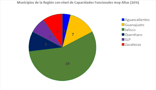 Así, el 16% de los municipios de la Región cuentan con ICFM muy altas. Cierto que muchos de ellos corresponden a las capitales de los estados, pero otros, como San Francisco de los Romo, en Aguascalientes, el municipio de Corregidora en Querétaro, Guadalupe en Zacatecas o Celaya en Guanajuato, así como Zapopan en Jalisco o Soledad en SLP, son municipios que se han venido destacando y mejorando sus capacidades funcionales de forma sustantiva. Se trata de que los municipios lleven a cabo acciones que mejoren el desarrollo humano de sus habitantes.