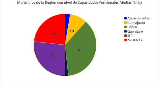 En cuanto a la Región vecina a Aguascalientes, tenemos que se presentan 13 lugares entre Querétaro y San Luis Potosí en materia de proporción de municipios con capacidades funcionales muy altas y altas con relación a aquellos que, estando dentro del mismo estado, presentan capacidades funcionales medias o bajas.