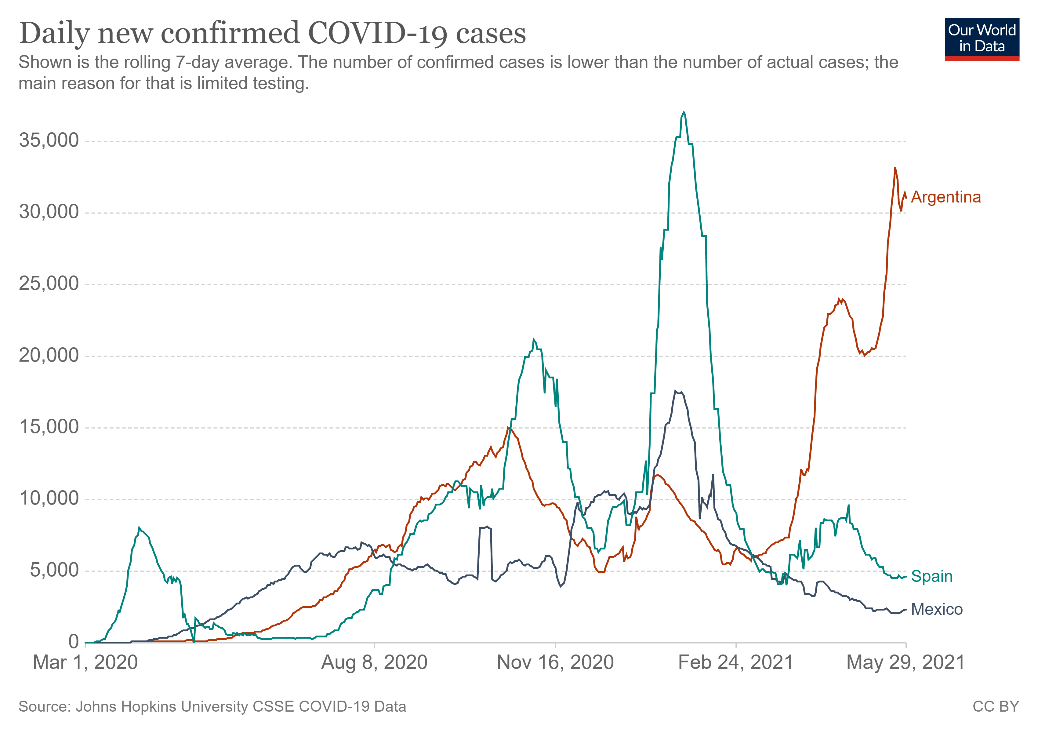 La pandemia de COVID-19 ha afectado gravemente varias partes del mundo, ocasionando millones de casos y fallecimientos. México se encuentra desde hace varias semanas en un descenso franco de casos, hospitalizaciones y muertes, sin embargo esto no ocurre así en otros países, donde la pandemia ha crecido fuertemente en el mismo periodo de tiempo, como Argentina.