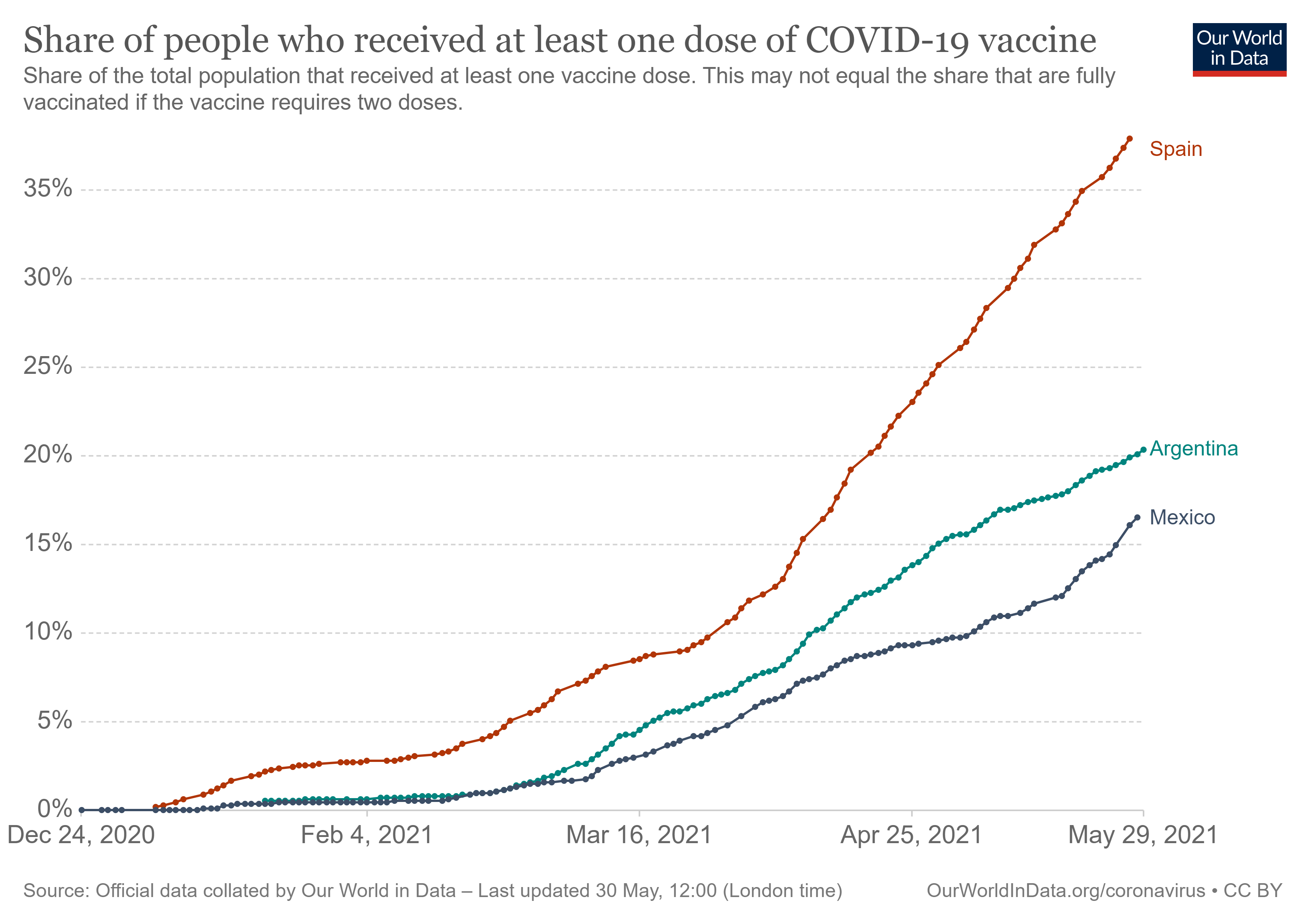 Argentina está cerca del 20% de su población vacunada una vez, mientras que México es el que menor porcentaje ha logrado con cerca del 15%. Sin embargo, cabe recordar que este último tiene mayor cantidad de población, por lo que son necesarias más inoculaciones para lograr mayor avance.