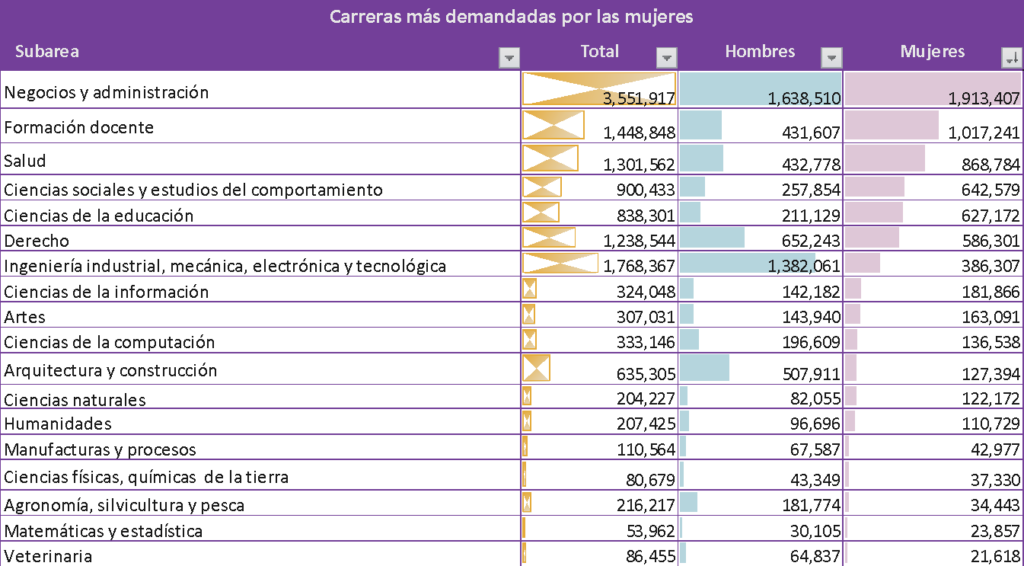 Las carreras más demandadas por las mujeres corresponden a las de negocios y administración; la formación docente y las ciencias sociales, de la salud y del comportamiento. Es menor su incursión en las ingenierías, arquitectura, construcción y agronomía.