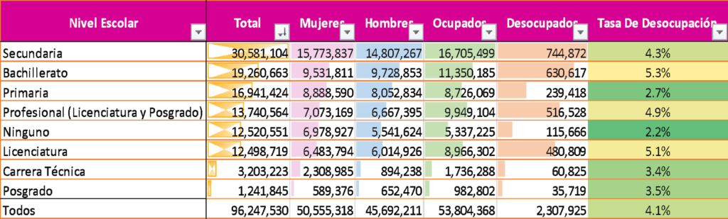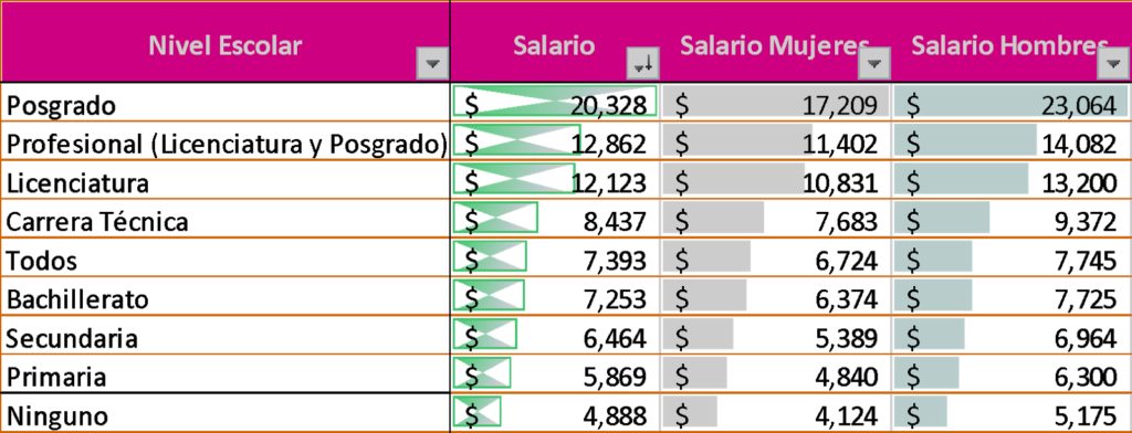 El mayor salario detectado por el IMCO, es para los hombres con posgrado que cotizan alrededor de 23 mil pesos, en oposición al de las mujeres sin instrucción alguna que perciben alrededor de 4 mil 888 pesos mensuales. Es decir, existe una diferencia de 4.72 veces entre el salario mayor y el de menor denominación. Aunque dicho sea de paso que la tasa de desocupación es mayor entre quienes tienen posgrado (3.5%) que entre los efectivos que no cuentan con instrucción (2.2%). En un país con una tasa de desocupación del 4.1% con las tasas más altas para quienes cuentan con bachillerato (5.3%) y alguna licenciatura (5.1%).