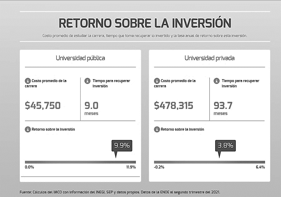 Siguiendo al IMCO, tenemos, que las carreras universitarias cursadas en el sector público cuestan alrededor de 50 mil pesos y en las universidades privadas 500 mil o más según la institución, por lo que el tiempo que toma recuperar la inversión es diez veces mayor en las privadas que en las públicas. Es decir, entre 10 o 100 meses de salarios.