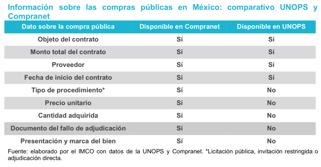 De acuerdo con el portal de la Unops, hasta mayo de 2021 se adjudicaron 82 contratos por 18 mil millones de pesos. El Instituto Mexicano para la Competitividad (IMCO) encontró que este solo incluye el nombre del medicamento, el importe total del contrato, la fecha del contrato y el nombre del proveedor. Estos datos son menos de los que estarían disponibles en Compranet de haber realizado las contrataciones desde las instituciones federales.