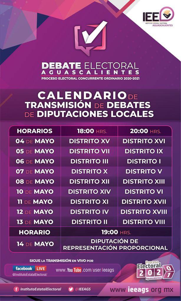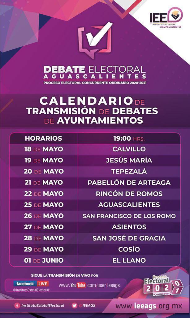 La transmisión de los debates se llevará a cabo por las páginas de Facebook y YouTube del Instituto Estatal Electoral de Aguascalientes.
