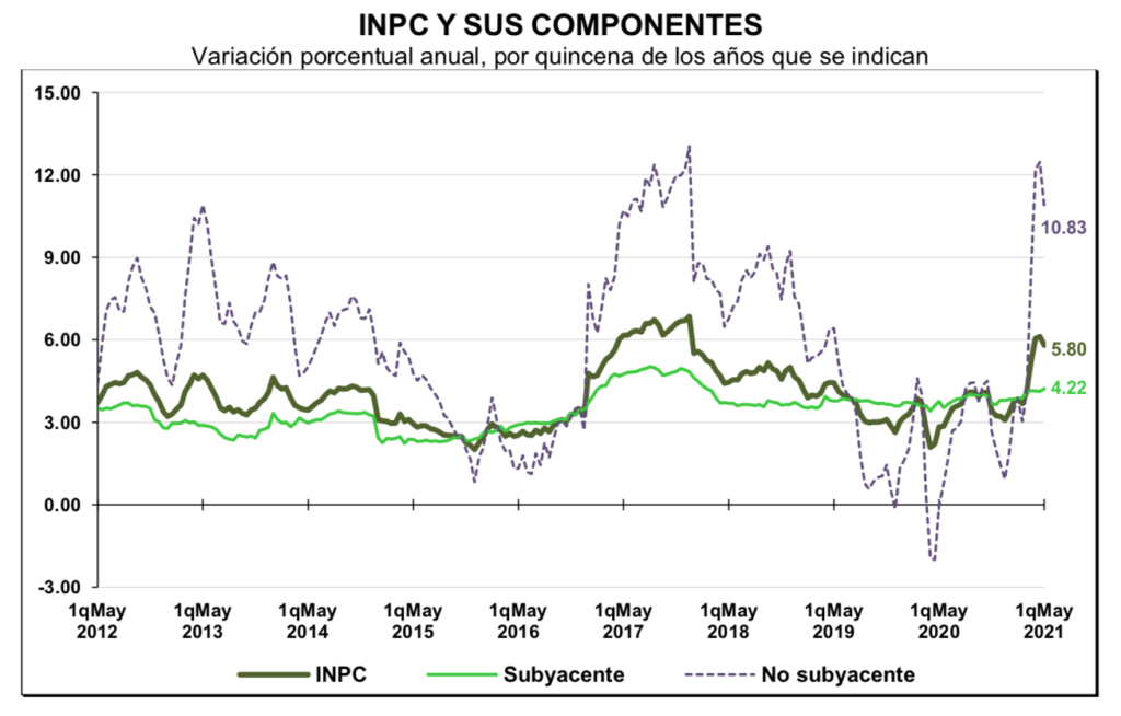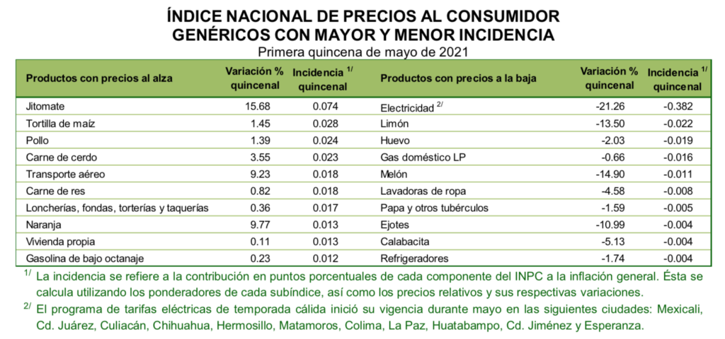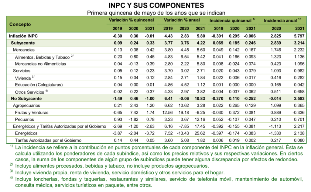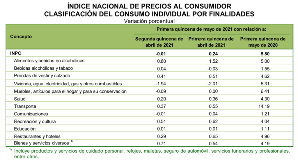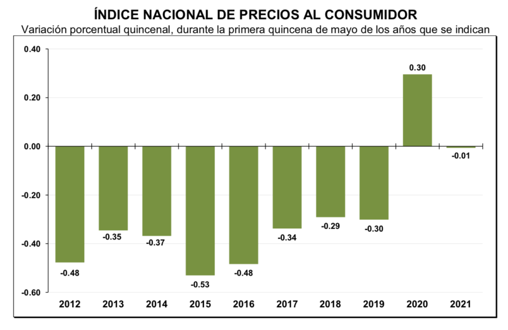 El Instituto Nacional de Estadística y Geografía (Inegi) informa que en la primera quincena de mayo de 2021 el Índice Nacional de Precios al Consumidor (INPC) registró una inflación de (-)0.01% respecto a la quincena inmediata anterior; con este resultado la inflación anual se ubicó en 5.80%. En el mismo periodo de 2020 la inflación mostró alzas de 0.30% quincenal y de 2.83% anual.
