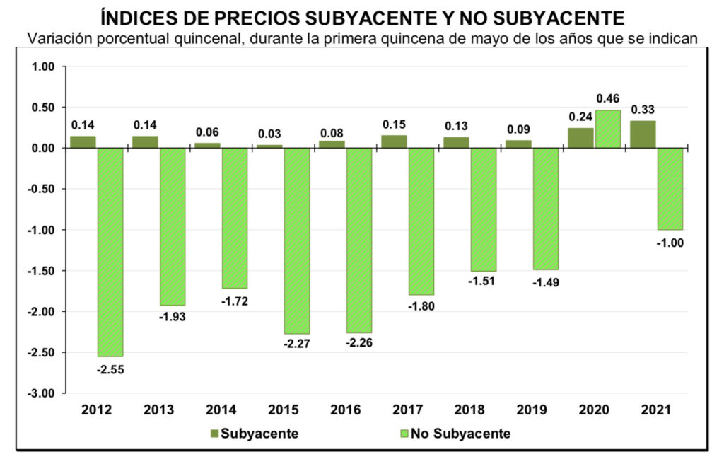 La variación en la primera quincena de mayo del año en curso de los índices subyacente y no subyacente fue de 0.33 y de (-)1.00% con relación a la quincena inmediata anterior, respectivamente. Los datos correspondientes para el mismo lapso de 2020 fueron de 0.24 y de 0.46%.