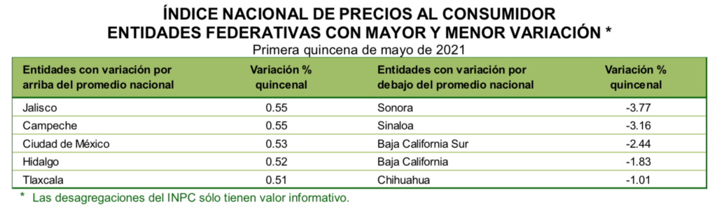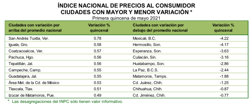 En los siguientes cuadros se muestran las entidades federativas y ciudades con la mayor y menor variación de precios en la primera quincena de mayo de 2021.