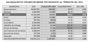 Por municipio, las divisas recibidas son muy dispares, mientras en el municipio de la capital se reciben 94 centavos de dólar por día por persona, en Calvillo la cantidad se multiplica para recibir 4.41 dólares diarios por habitante y en Rincón de Romos y Pabellón de Arteaga 2.56 y 2.25. Los municipios que reciben menos participaciones son: Tepezalá y El Llano que obtienen 16 y 20 centavos de USD per cápita al día.
