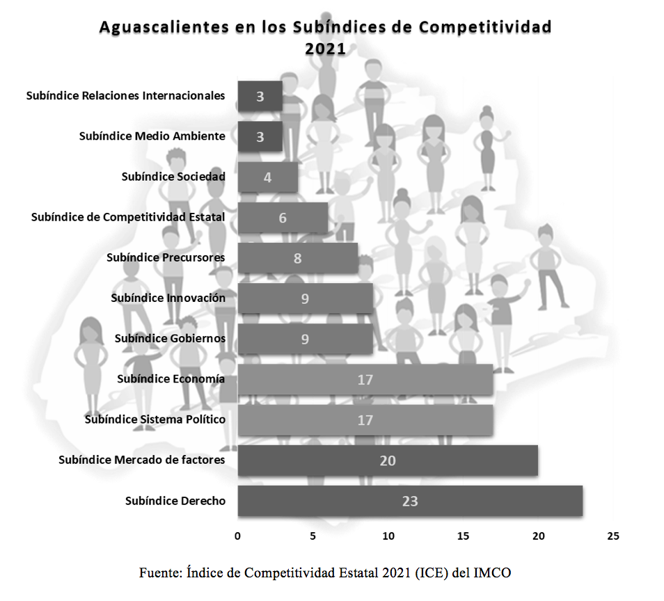 Aguascalientes es sexto en la tabla habiendo sido 5° con promedios semejantes a Perú en América Latina. Destaca como tercer lugar en Relaciones Exteriores, tercero en Medio Ambiente y cuarto en Sociedad. Sus tres posiciones más bajas las obtiene en: Sistema Político, Mercado de Factores y el último como lugar 23/32 en el subíndice de derecho.