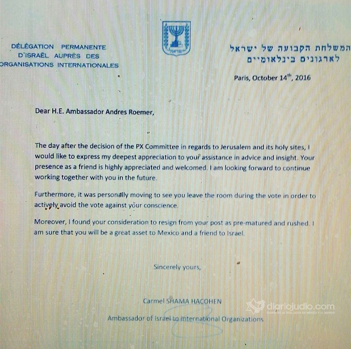 Aquel detalle tiene su raíz años atrás, cuando en octubre de 2016, como embajador de México ante la Unesco, Roemer informó a representantes de gobiernos distintos al suyo el sentido de su voto relativo a la preservación del patrimonio cultural y religioso en Jerusalén Oriental. Según informó la SRE, hizo públicos documentos y correspondencia oficial, por lo cual fue despedido.
