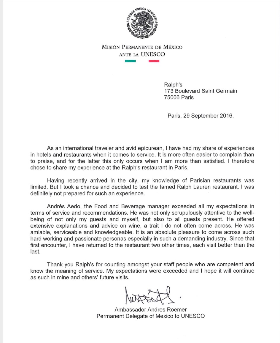 “Quedamos encantados con su profesionalismo y servicio, por lo que quería felicitarlo a usted y a todo su equipo en nombre de la Delegación Mexicana de la Unesco”, escribió.