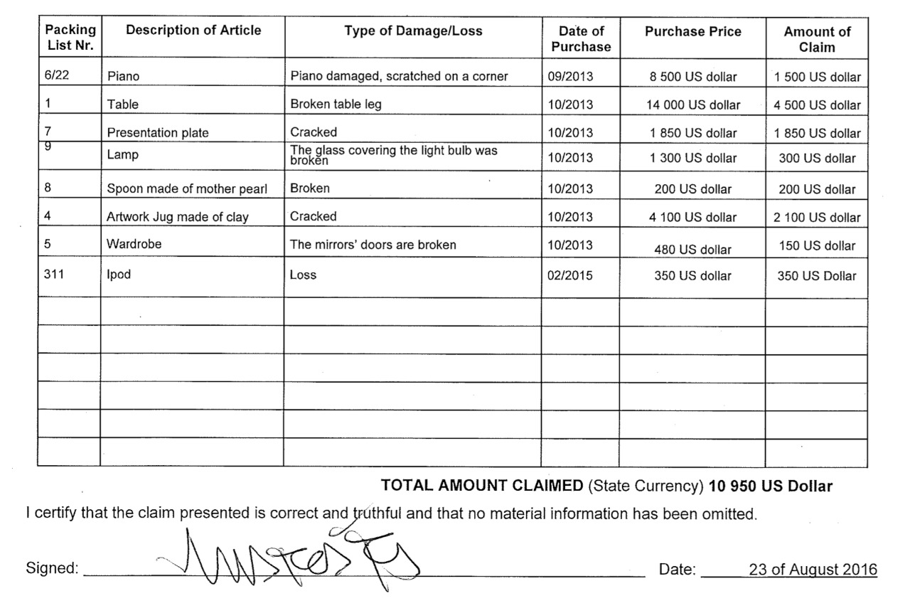 El piano, detalló, tenía una rasgadura, por lo que consideró que debería pagársele 27 mil pesos a modo de indemnización. Un plato de presentación estaba quebrado, solicitó el reembolso del costo total: 34 mil pesos. Una jarra de arcilla, quebrada, valía 38 mil. Una mesa llegó con una pata rota: pidió 83 mil pesos.