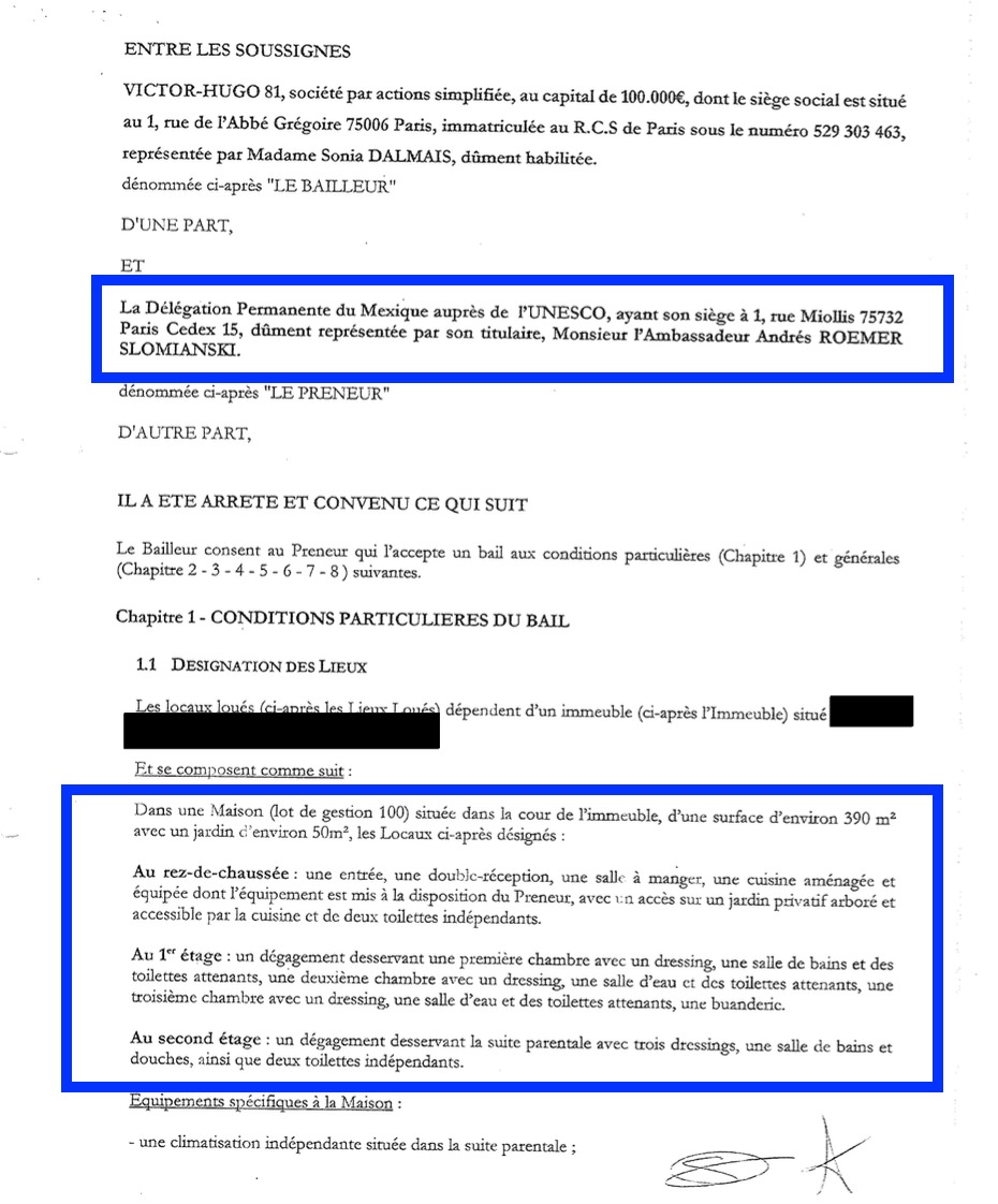 La residencia, estipula el contrato de arrendamiento, tenía un precio de renta de 11 mil euros mensuales, incluyendo el mantenimiento; sin embargo, extrabajadores de la Delegación de México ante la Unesco consultados por EMEEQUIS coincidieron en que se pagaba otro monto de 4 mil euros al mes fuera de contrato, para completar el valor total de la renta del inmueble,15 mil euros.