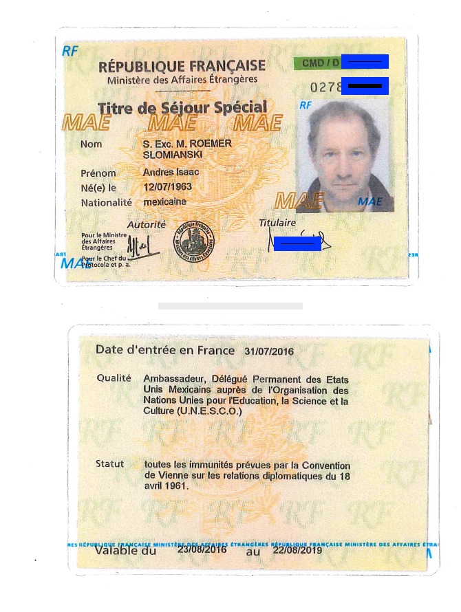 Asimismo, se le otorgó un permiso de residencia en calidad de embajador, con una vigencia de tres años, pues se esperaba que Roemer se quedara en Francia hasta agosto de 2019.