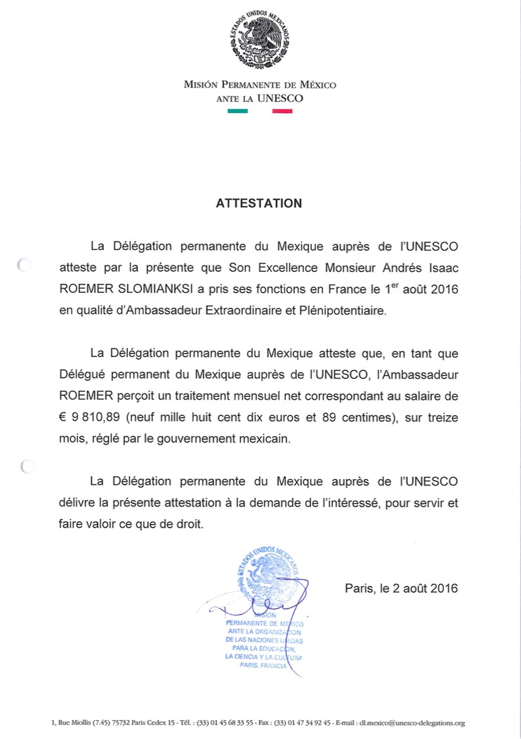 De acuerdo con el certificado de la Misión Permanente de México ante la Unesco, en este nuevo puesto Andrés Roemer percibió un salario mensual de 9 mil 810 euros (202 mil 772 pesos mexicanos, al tipo de cambio de aquel año), el monto estipulado en el tabulador de la nómina del Servicio Exterior Mexicano.