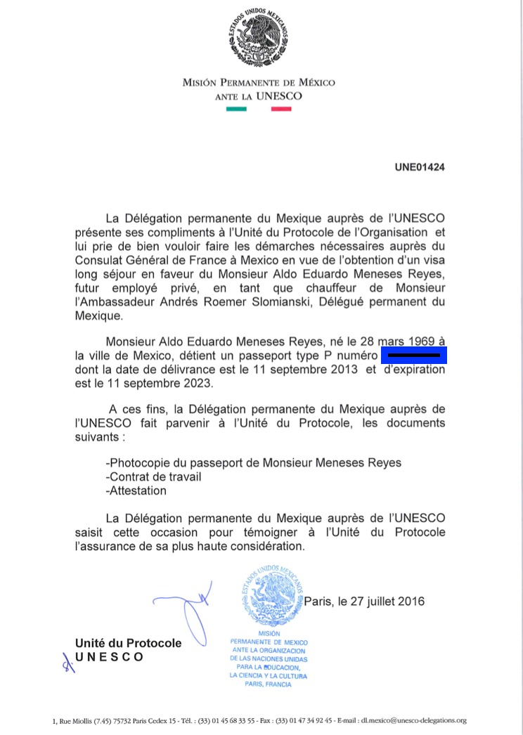 Así, bajo su cargo de embajador, solicitó que la delegación interviniera y realizara todos los trámites para llevar hasta Francia a Aldo Eduardo Meneses Reyes. Le consiguió pasaporte, visa, permiso de larga estancia y de trabajo –algo complicado para un extranjero común que busca empleo en este país–. Incluso existen varios documentos, en poder de EMEEQUIS, que acreditan que se le nominó de forma oficial “personal privado del embajador”.