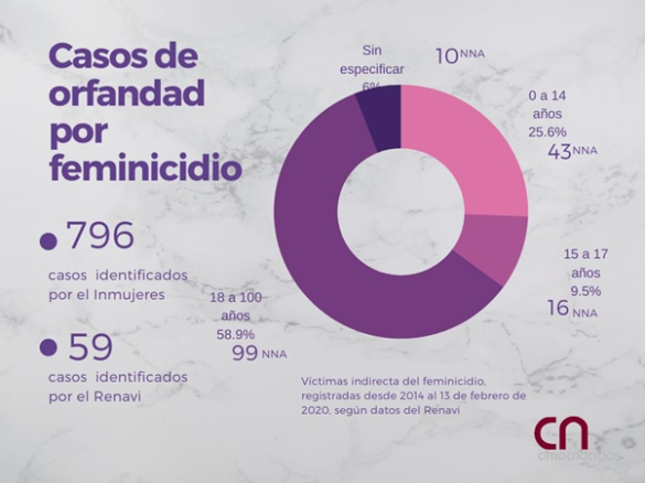 Por otra parte, de acuerdo con el Renavi, de la Comisión Ejecutiva de Atención a Víctimas, de 2014 al 13 de febrero de 2020, se reconoció a 59 niños, niñas y adolescentes como víctimas indirectas de feminicidio. Es decir, en 6 años el Renavi apenas incluyó cerca de 7 por ciento del total de casos localizados en 2019 por el Inmujeres.