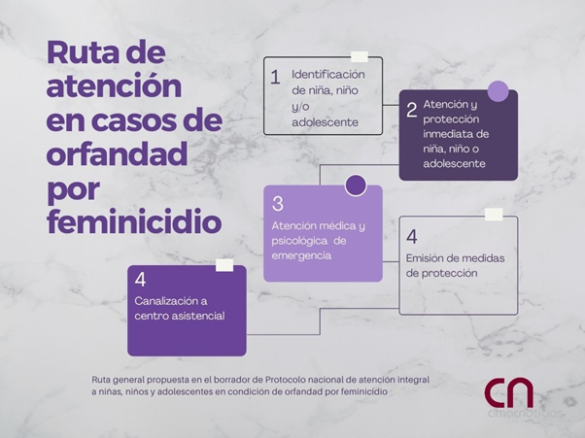 Sin embargo, el Proyecto del Protocolo Nacional de Atención Integral a Niñas, Niños y Adolescentes en Condición de Orfandad por Feminicidio de 93 hojas, obtenido en diciembre de 2020 por medio del mecanismo de acceso a la información, establece que la ruta de atención comienza cuando hay una llamada de emergencia al 911 para dar cuenta de un feminicidio. En estas listas de actividades a seguir se consideran acciones como preguntar si hay niñas o niños en el lugar y en su caso informar a la Procuraduría de Protección (a cargo del DIF). La lista de pasos llega hasta la elaboración de un Plan de Restitución de Derechos.