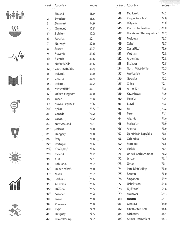 México es ahora muy superado por países latinoamericanos como Chile, Uruguay y Costa Rica posicionados entre los lugares 30 a 50, e incluso por Argentina, Ecuador, Perú, Brasil y Colombia con agendas complicadas, pero con calificaciones que les permite ocupar puestos entre el 51 y el 70. Es decir, entre 10 y 50 lugares separan al país de estos ocho países latinoamericanos en materia de cumplimiento de los Objetivos de Desarrollo Sostenible y no se ve que se estén tomando en serio los compromisos como para remontar la posición actual mucho más cercana a posiciones de carácter centroamericano.