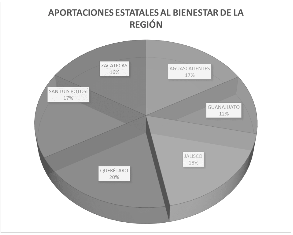 En aportaciones para el bienestar de la Región Centro Bajío Occidente tenemos un mejor desempeño de Querétaro que aporta el 20%; luego Jalisco que aporta un 18% al bienestar, le siguen Aguascalientes y San Luis Potosí con un 17% para cerrar con Zacatecas y Guanajuato aportantes del 16 y 12% respectivamente.