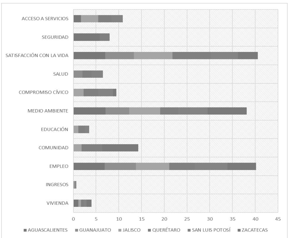 La región Centro Bajío Occidente presenta altos puntajes en EMPLEO, MEDIO AMBIENTE y SATISFACCIÓN CON LA VIDA; presenta valores medios en COMUNIDAD, ACCESO A SERVICIOS, COMPROMISO CÍVICO, SEGURIDAD Y SALUD y valores menores en VIVIENDA, EDUCACIÓN e INGRESO, este último es el valor menos destacado en términos de satisfacción con la vida, de hecho, se cuestiona el balance “VIDA – TRABAJO”.