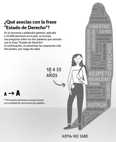 De los 18 a los 35 años lo que más se asocia con “Estado de Derecho” son el respeto, la igualdad, la libertad, el derecho y la justicia. En particular, la libertad de expresión, tener valores y el rechazo a la corrupción. Prácticamente la mitad de las personas en esas edades no sabe asociar “Estado de Derecho” con ningún concepto significativo.