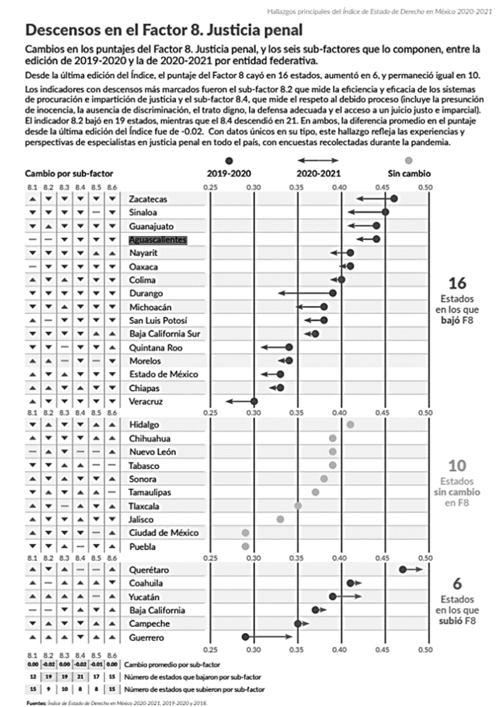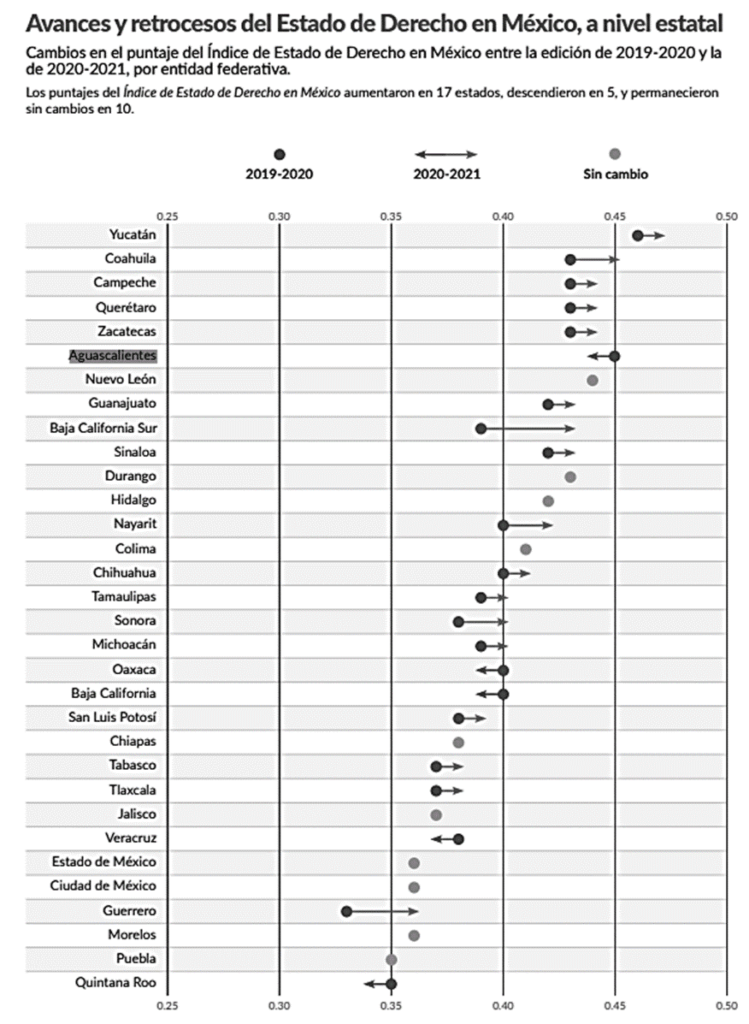 Desde la última edición del Índice de Estado de Derecho en México (2019-2020), se registraron incrementos modestos en los puntajes de 17 estados (Baja California Sur, Campeche, Chihuahua, Coahuila, Guanajuato, Guerrero, Michoacán, Nayarit, Querétaro, San Luis Potosí, Sinaloa, Sonora, Tabasco, Tamaulipas, Tlaxcala, Yucatán y Zacatecas), descensos en los puntajes de 5 entidades (Aguascalientes, Baja California, Oaxaca, Quintana Roo y Veracruz), y 10 estados permanecieron sin cambios en sus promedios (Chiapas, Ciudad de México, Colima, Durango, Estado de México, Hidalgo, Jalisco, Morelos, Nuevo León y Puebla).
