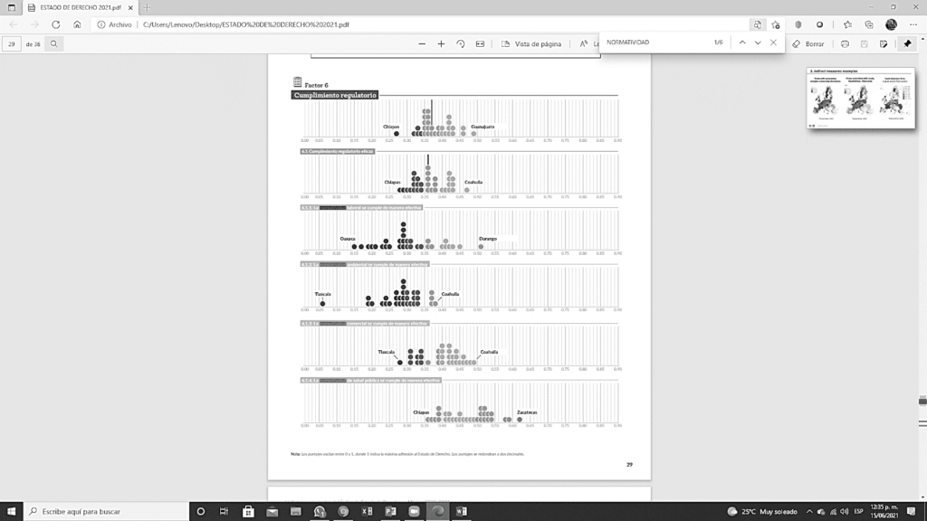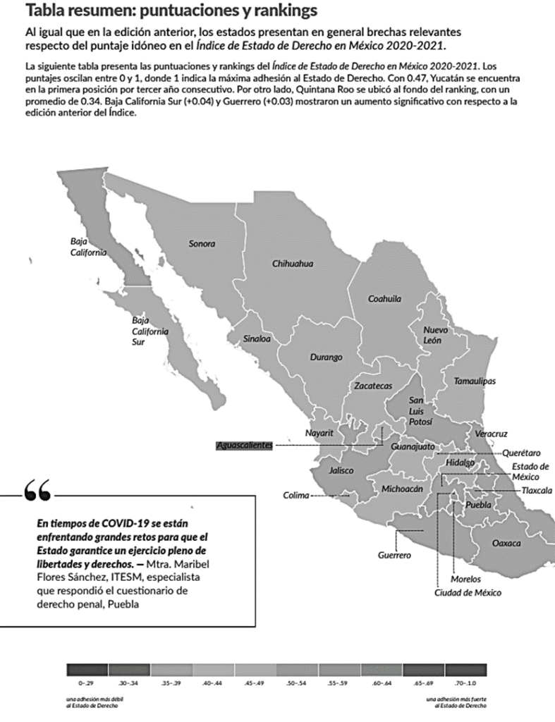 El Índice de Estado de Derecho en México 2020-2021 en su tercera edición es el único índice con carácter subnacional producido por el World Justice Proyect, constituye una de las mediciones más completas sobre el desempeño institucional de los estados del país. El Índice presenta datos e indicadores originales, los cuales se organizan en ocho factores, que a su vez se desagregan en 42 sub-factores. Para presentar un retrato preciso de cómo se experimenta el Estado de Derecho desde una perspectiva ciudadana. Se aplica encuesta a 25,600 personas y cuestionarios a especialistas, dirigidos a abogadas y abogados especializados en: i) derecho civil, administrativo o mercantil; ii) derecho penal; iii) derecho laboral; así como a personal especializado en iv) salud pública. También, el WJP recopila datos de fuentes terciarias. Es decir, datos administrativos y encuestas con representatividad estatal sobre temas de Estado de Derecho.