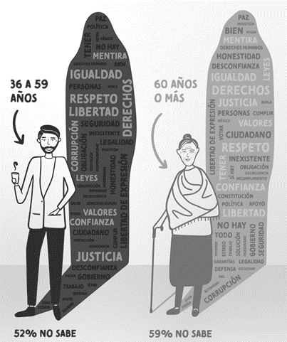 De los 36 a los 59 años lo que más se asocia con “Estado de Derecho” son el respeto, la igualdad, la libertad, los derechos y la justicia. En particular, valores como la confianza, que no haya mentira y corrupción y que se cumplan las leyes. Prácticamente la mitad de las personas en esas edades no sabe asociar “Estado de Derecho” con ningún concepto significativo.