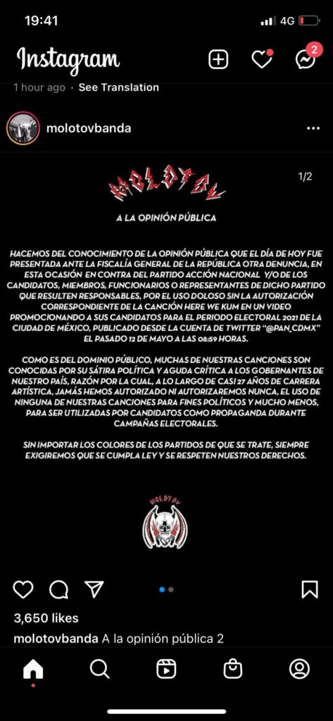 El grupo eveló más detalles: fue desde los canales @PAN_CDMX la vía institucional en la PAN que utilizó la canción de la banda de manera ilegal con “uso doloso, sin autorización” en promoción de un candidato.
