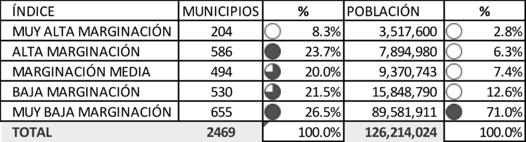 En el ámbito municipal, la estimación del índice de marginación muestra que prácticamente uno de cada tres municipios presenta alta y muy alta marginación, en donde se asientan más de 11.4 millones de personas, esto representa 9.1% de la población nacional.