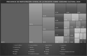 De los 8,780 encuestados, 48.7% se ubica en la Ciudad de México y el resto, esto es, 51.3%, en otros puntos de la República. Una franca muestra de que el proceso de descentralización cultural se encuentra inconcluso. Las entidades federativas con mayor participación fueron el Estado de México, Guanajuato, Veracruz, Jalisco, Aguascalientes, Morelos, Quintana Roo, Puebla, Yucatán, Nuevo León, Hidalgo y Querétaro. Por regiones, las que tuvieron una respuesta mayor fueron Centro y Centro Occidente, de esta última, se presentaron diez de cada cien reactivos de la encuesta. En la siguiente tabla se aprecian las sobre representaciones estatales. Destaca que, después de la CDMX y el Estado de México, Aguascalientes es el estado que más respondió al llamado de la encuesta.