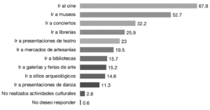 Las actividades menos frecuentes fueron: ir a bibliotecas; ir a galerías y ferias de arte; ir a sitios arqueológicos; e ir a presentaciones de danza.